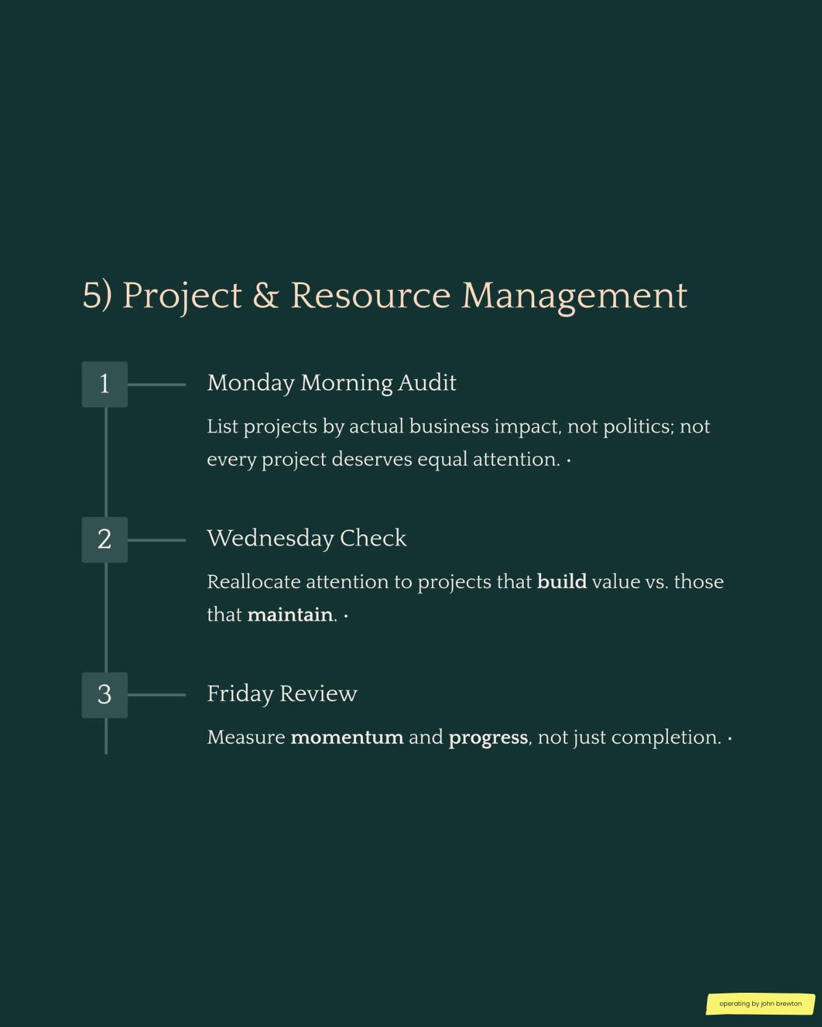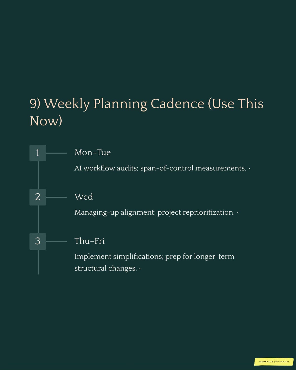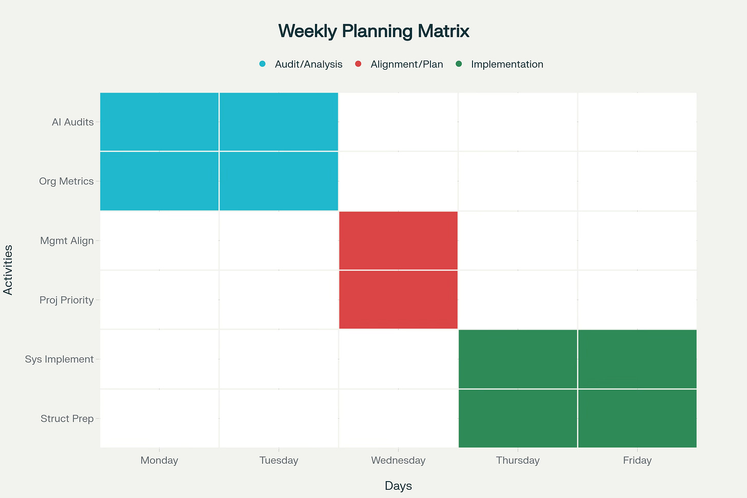 One-week operating cadence, audit on Monday and Tuesday, align on Wednesday, implement on Thursday and Friday.