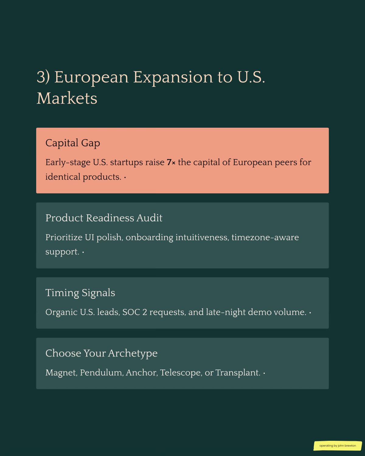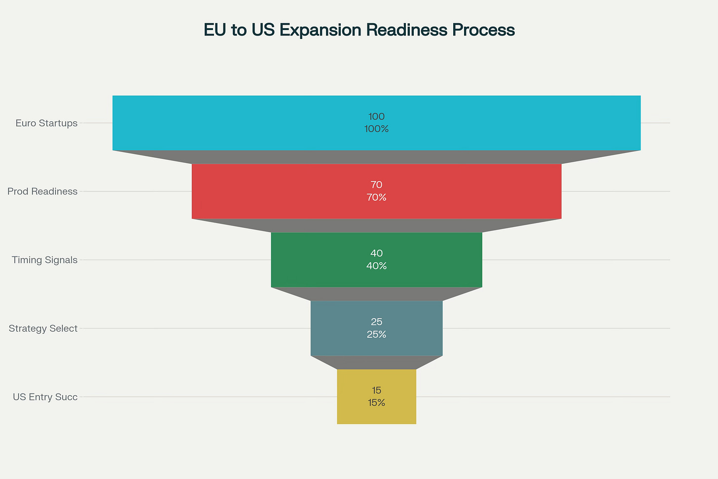 Most EU startups stall before timing and strategy selection, which is why the section stresses product readiness, timing signals, and a deliberate entry model.